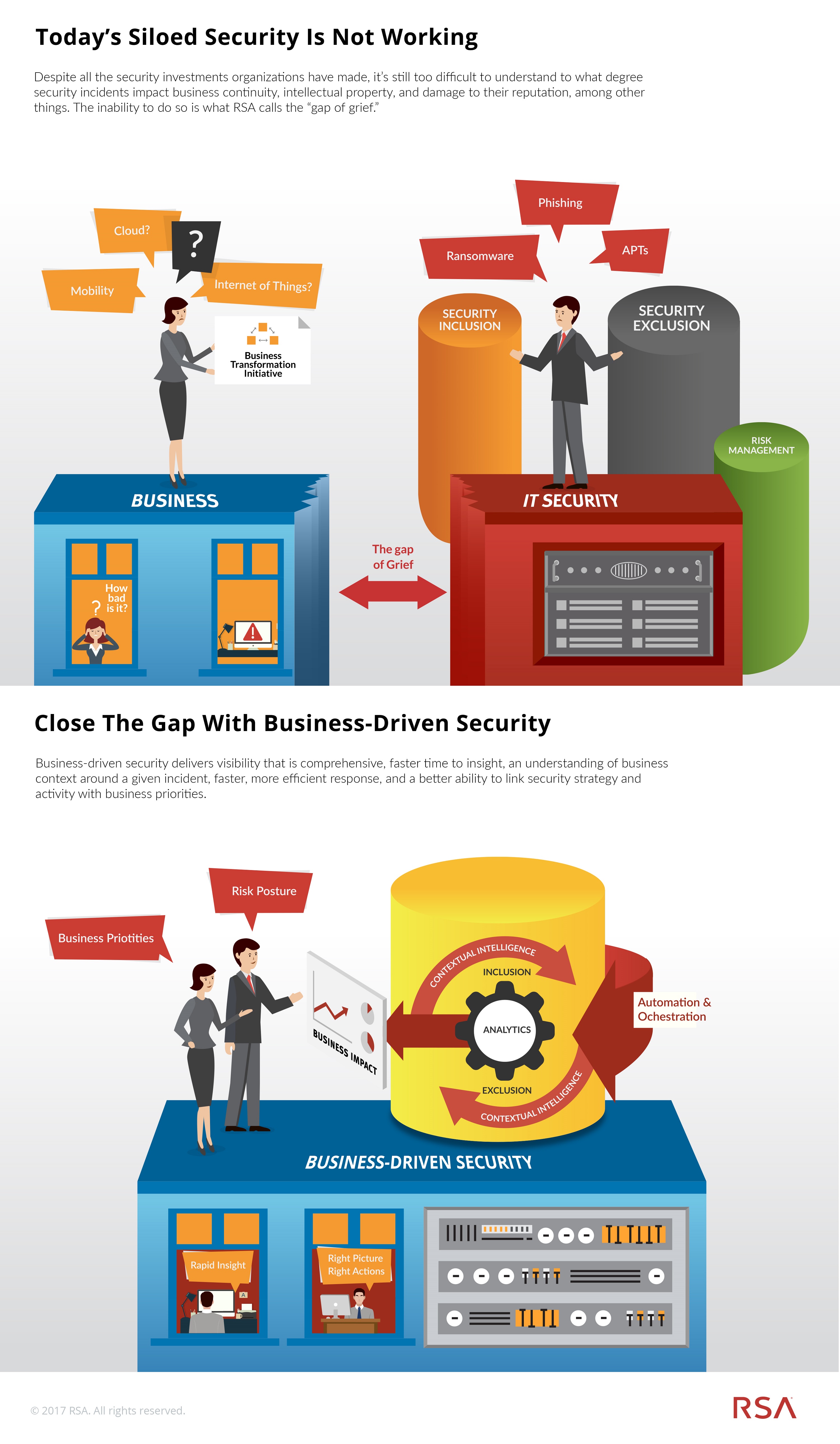 Today, a disconnect exists between management and IT departments that exacerbate the multi-billion-dollar losses and cybersecurity expenses that organizations incur every year. This misalignment stems from a traditional “silo” approach to cybersecurity: management orchestrates the daily operations of the company, while the security team focuses on cyberthreats. This results in what RSA calls a “gap of grief,” which impairs an organization’s ability to mitigate and defend against threats. RSA outlines several key steps to bridge this gap by transforming a disconnected approach into a business-driven security™ strategy.